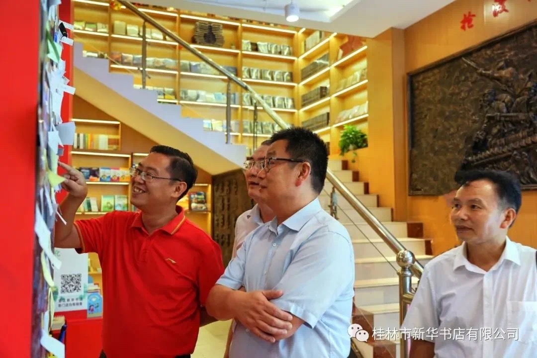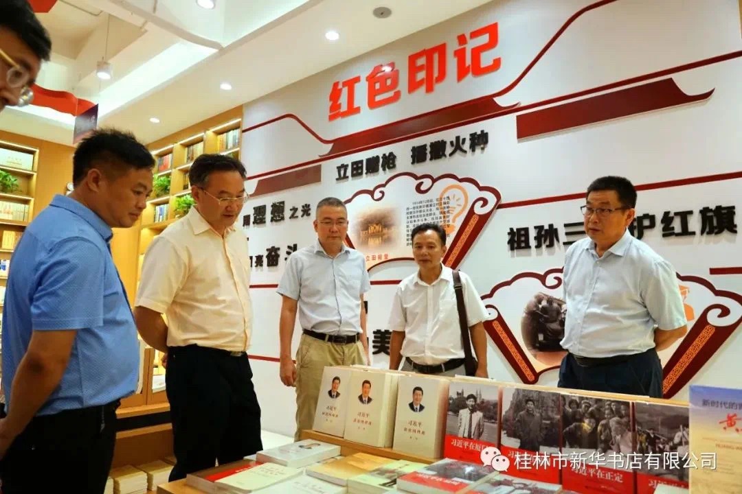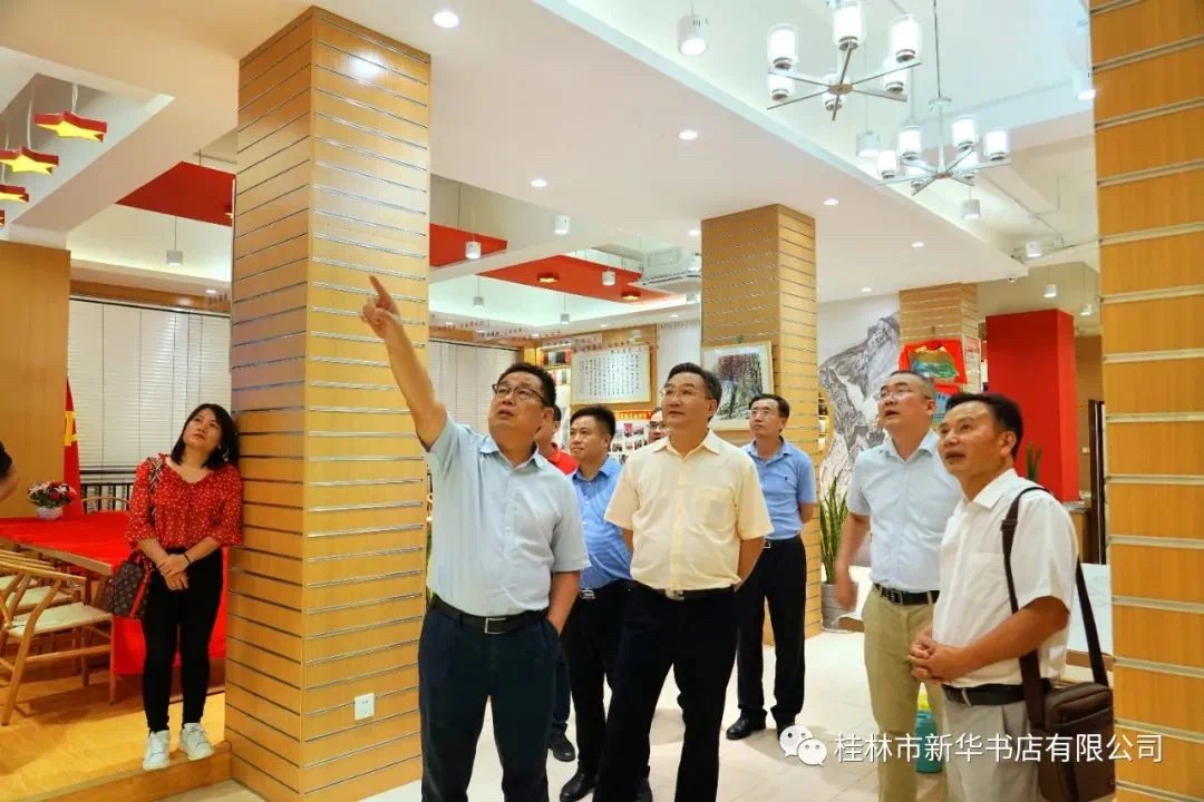 王晓华一行在灌阳红色书店关切询问《习近平谈治国理政》第三卷等重点图书的发行情况,并听取灌阳县公司经理刘毅关于实施实体书店转型升级为灌阳红色书店的工作情况汇报,以及灌阳红色书店在打造“八桂特色书店”工作中的一些具体做法。随后王晓华一行实地考察了转型升级后的灌阳红色书店,对整个红色书店的设计理念及创意给与高度评价,认为灌阳红色书店在转型升级上充分应用当地的红色文化元素以及当地传统文化,既有鲜明的文化主题,又很好的融入了现代文化元素,在经营理念上实现了创新经营模式。