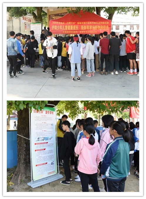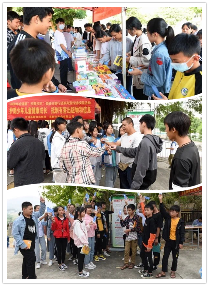 10月20至11月4日,2020年合浦县“扫黄打非”暨绿书签行动系列宣传进校园工作队先后到达西场、总江、闸口等八所乡镇中学开展宣传活动。工作队在活动现场悬挂“护助少年儿童健康成长,抵制有害出版物和信息”横幅宣传标语,摆放“扫黄打非”宣传专栏,向现场学生发放“护苗2020”专项行动绿书签。为配合这次活动,合浦县新华书店现场推出一批正版优秀的中学生课外必读古今中外文学名著、最新版《新华字典》、《现代汉语词典》第七版、《古汉语常用字字典》、《活用多功能英汉汉英词典》等学生工具书、学生学习辅导用书,方便师生们选购。