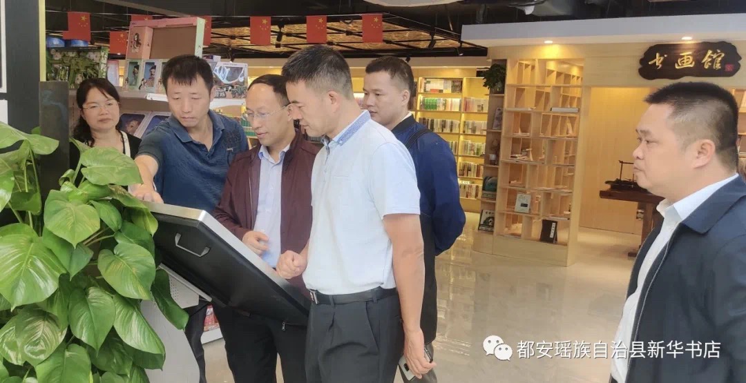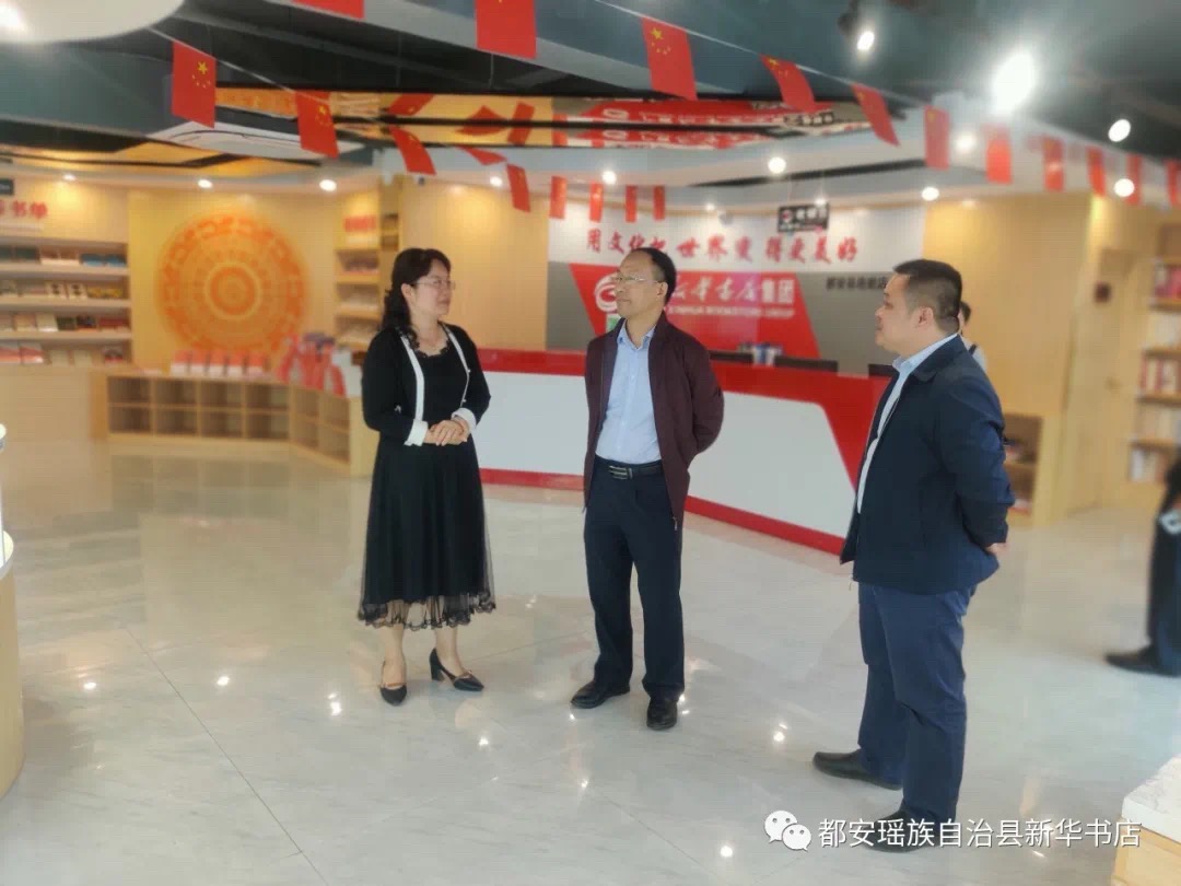 周三胜处长首先来到都安县新华书店有限公司都安书城。在书城里,周处长对书城的装修风格、图书分类陈列、区域划分、店堂智能化展示等都进行了详细的了解。对都安书城转型升级后多元化经营模式给予赞许并提出指导性的建议。他指出都安书城是今年疫情后转型升级重新开业的一家实体书店实属不易,是都安县重要的文化设施和文明载体,在促进城乡文化产业发展和文化市场繁荣、巩固先进文化传播阵地、推动全民阅读、建设书香社会、提高全民素质等方面具有重要作用。都安书城的转型升级,很好地履行了社会服务功能,体现了社会效益和经济效益共同发展。并强调县委宣传部在各项工作中要给予更多的指导。