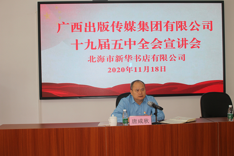 11月18日,广西出版传媒集团有限公司党委副书记、副董事长、总经理唐咸秋到北海市新华书店有限公司(以下简称“北海市公司”)开展十九届五中全会宣讲以及调研。