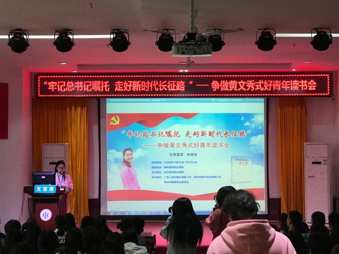 2020年6月26日,是习近平总书记对黄文秀同志先进事迹作出重要指示一周年。为深入学习宣传贯彻落实习近平总书记重要指示精神,激励全市广大团员青年以黄文秀同志为榜样,走好新时代的长征路,11月22日,由柳州城市职业学院主办,广西人民出版社有限公司、柳州市新华书店有限公司、柳州市朗诵专业委员会承办的“牢记总书记嘱托 走好新时代长征路”——争做黄文秀式好青年读书会活动在柳州城市职业学院举行,《新时代的青春之歌——黄文秀》作者林超俊、柳州城市职业学院团委副书记刘慧玲、柳州城市职业学院团员青年等150多人参加了读书会活动。