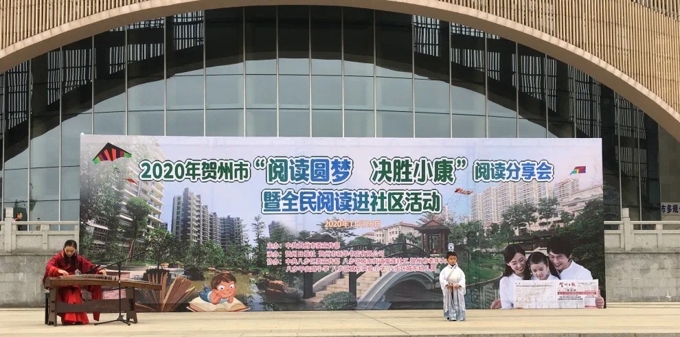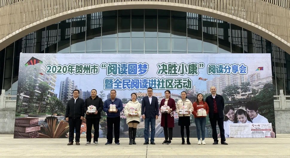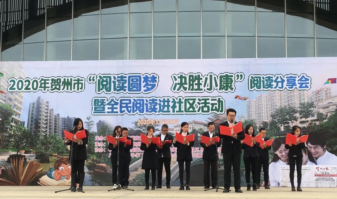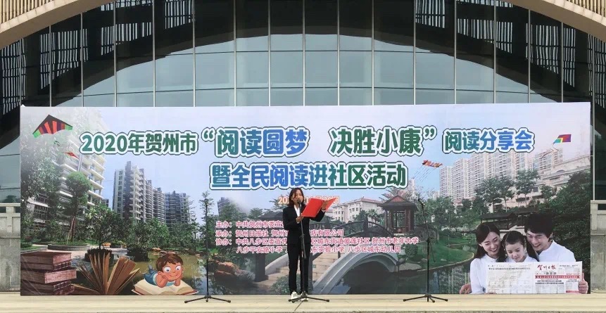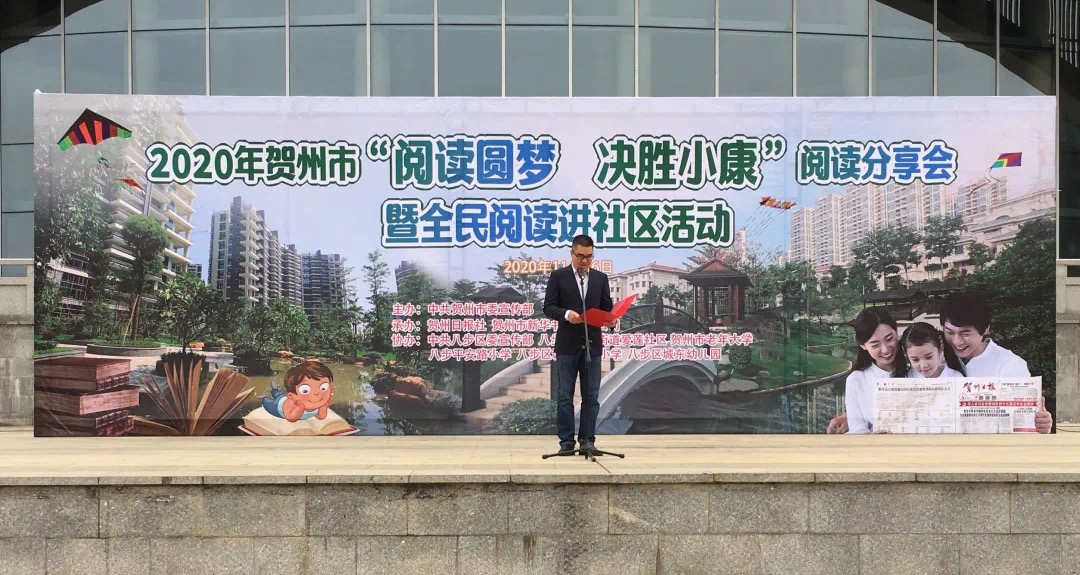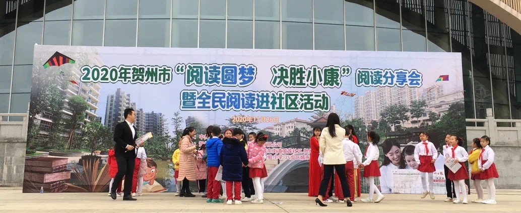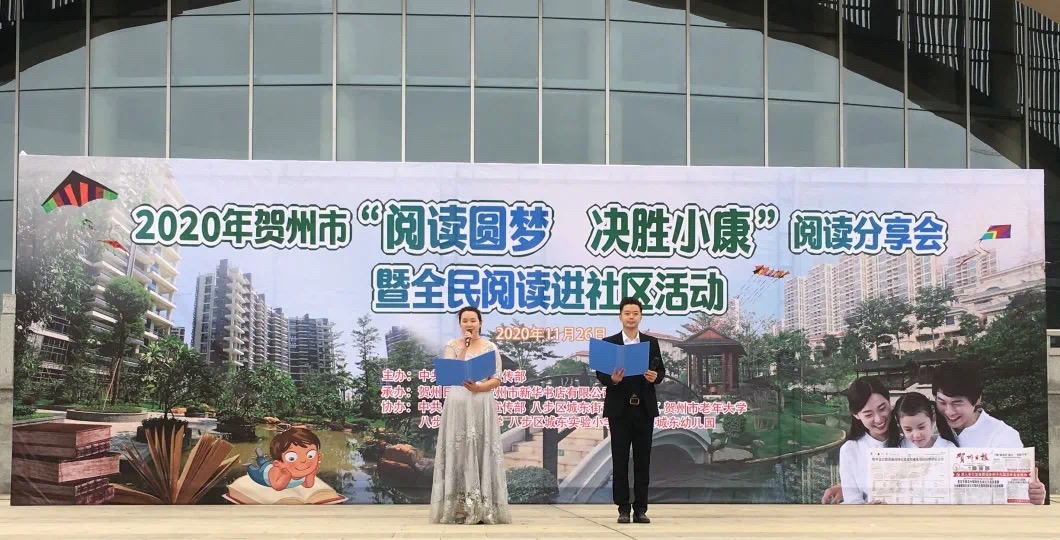 为进一步推进我市全民阅读活动,建设书香贺州,大力弘扬中华优秀传统文化,推动全市市民形成“读好书、好读书、读书好”的良好氛围,2020年11月26日一场由中共贺州市委宣传部主办,贺州日报社、贺州市新华书店有限公司共同承办,中共八步区党委宣传部、八步区城东街道爱莲社区、贺州市老年大学、八步平安路小学、八步区城东实验小学、八步区城东幼儿园联合协办的2020年贺州市“阅读圆梦 决胜小康”阅读分享会暨全民阅读进社区活动在贺州市文化中心广场拉开帷幕。整场活动围绕着“阅读圆梦 决胜小康”为主题进行展开,倡导全民阅读,营造浓厚的阅读氛围,让书香环绕在我们的生活当中。