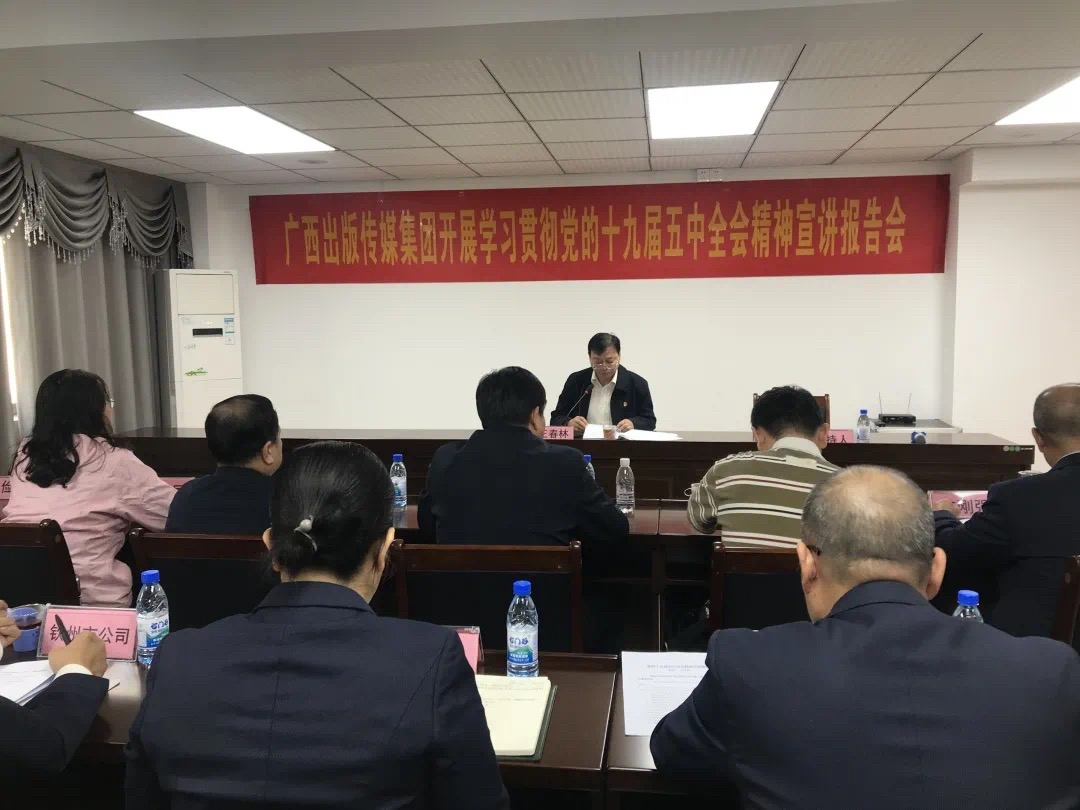 此次宣讲报告会由广西出版传媒集团有限公司副总经理王春林同志作宣讲报告,出席此次报告会的领导还有广西版传媒集团有限公司副总经理施伟文同志、广西人民出版社总编辑温六零同志、广西出版传媒集团财务部主任谢志川同志、广西教育出版社社长石立民同志、接力出版社社长黄俭同志。钦州市、县公司支委会成员、经营管理班子成员,钦州市公司全体员工约60人参加此次宣讲,宣讲报告会由钦州市公司党支部书记、总经理陈刚强主持。