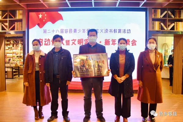 县委常委、宣传部部长、副县长秦健萍与县爱国主义读书教育活动组委会为获奖单位颁奖(图片来源于侨乡容县)
