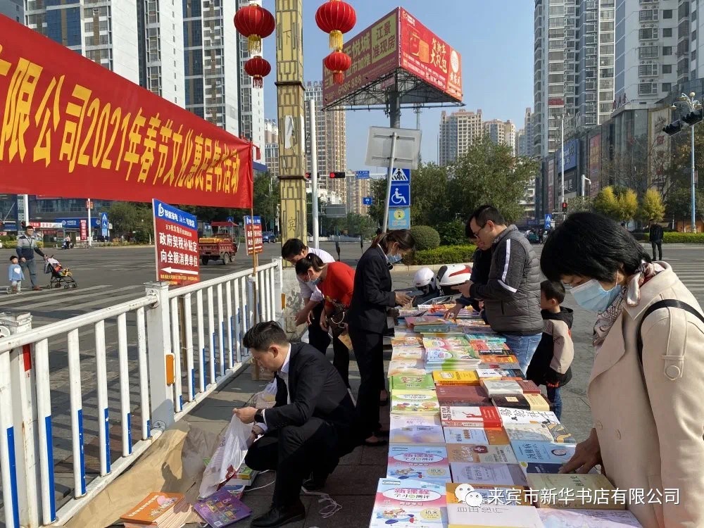 2月14日,来宾市新华书店有限公司(以下简称“来宾市公司”)到大洋购物广场前开展春节文化惠民售书活动,以丰富的精神食粮为当地人民送去新春祝福。
