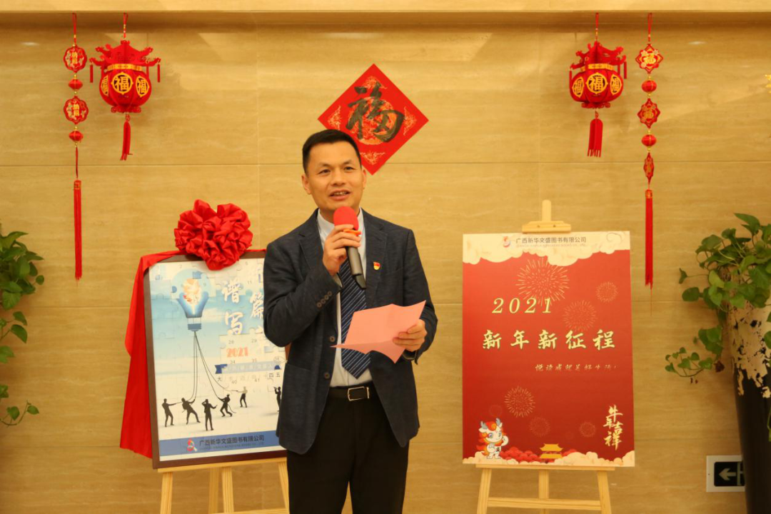 2月18日是今年春节长假后第一个工作日,广西新华文盛图书有限公司(以下简称文盛公司)举办了二月党员活动暨“2021新年新征程”团建活动。广西新华书店集团股份有限公司董事、副总经理邵福荣莅临指导并发表新年致辞。