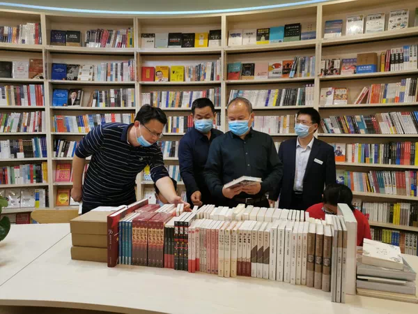 唐咸秋总经理(左三)、向润华副总经理(左二)、陈浩宇副部长(左一)在选购图书