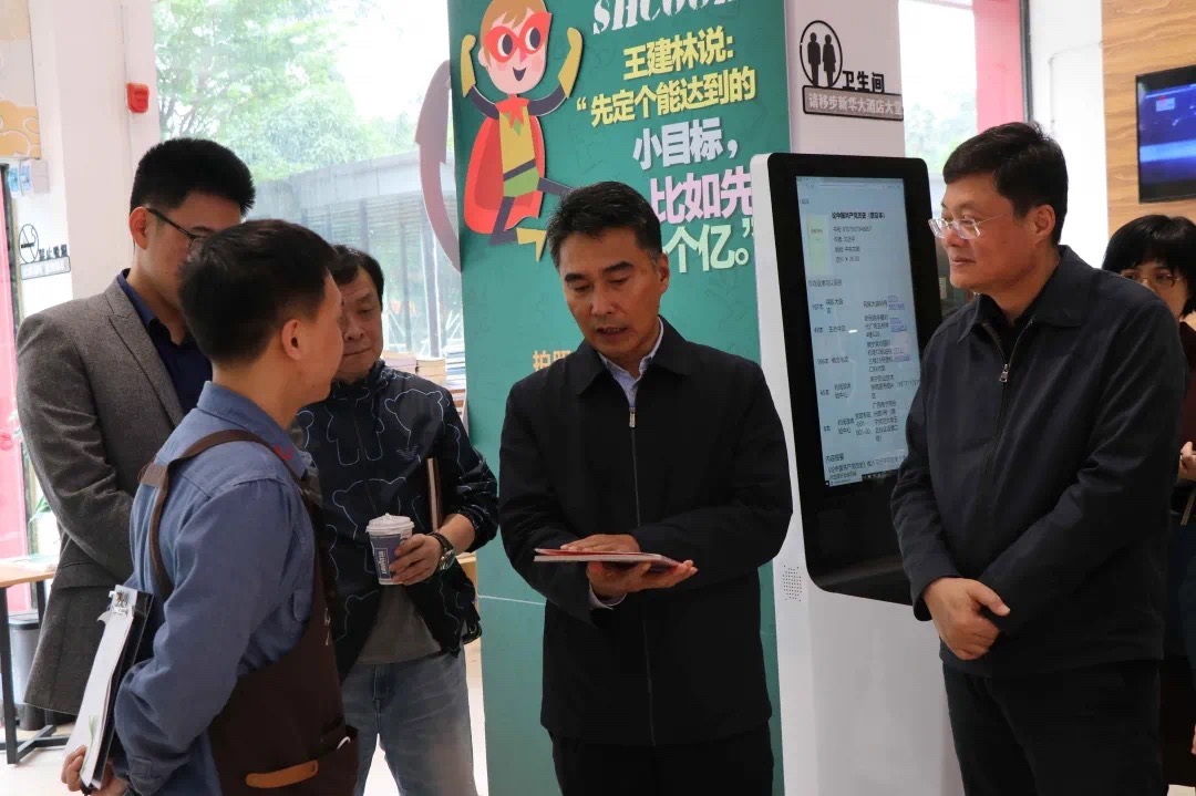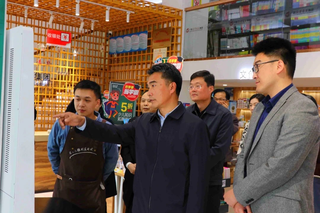 王乃学先后参观了民族大道店的重点图书推荐区、自有文创产品展台等区域,对店内陈设、经营特色、运营模式、服务标准进行了解,体验了店内智能化、人性化的服务设施,详细询问了出版物销售和服务读者等方面工作情况。