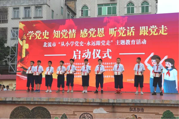 在仪式上,北流市教育局局长发言表示,要深入挖掘百年党史中蕴含的思想资源、实践智慧,通过组织开展“读起来、写起来、画起来、唱起来、看起来、讲起来、演起来”等“七个一”系列活动,深入开展党史学习教育,用党的奋斗历程和伟大成就鼓舞斗志,用党的光荣传统和优良作风坚定信念、凝聚力量,用党的实践创造和历史经验启迪智慧、砥砺品格,以优异成绩迎接建党一百周年。北流市人民政府副市长覃洁同志宣布仪式正式启动。