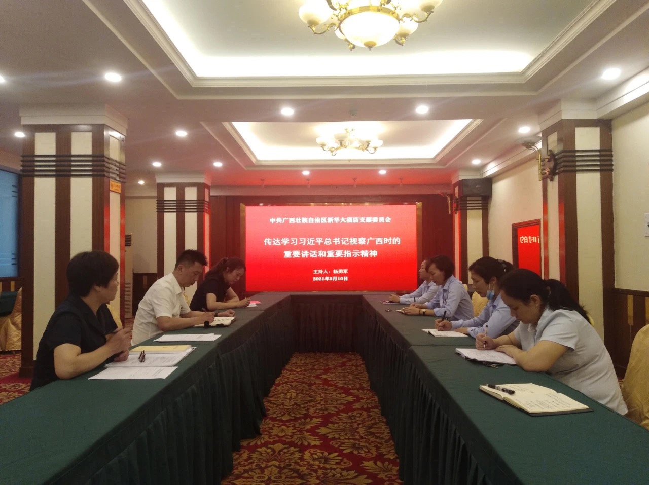 5月10日下午,广西新华大酒店党支部召开全体党员大会,传达学习习近平总书记视察广西时的重要讲话和重要指示精神,党支部书记杨勇军主持会议。