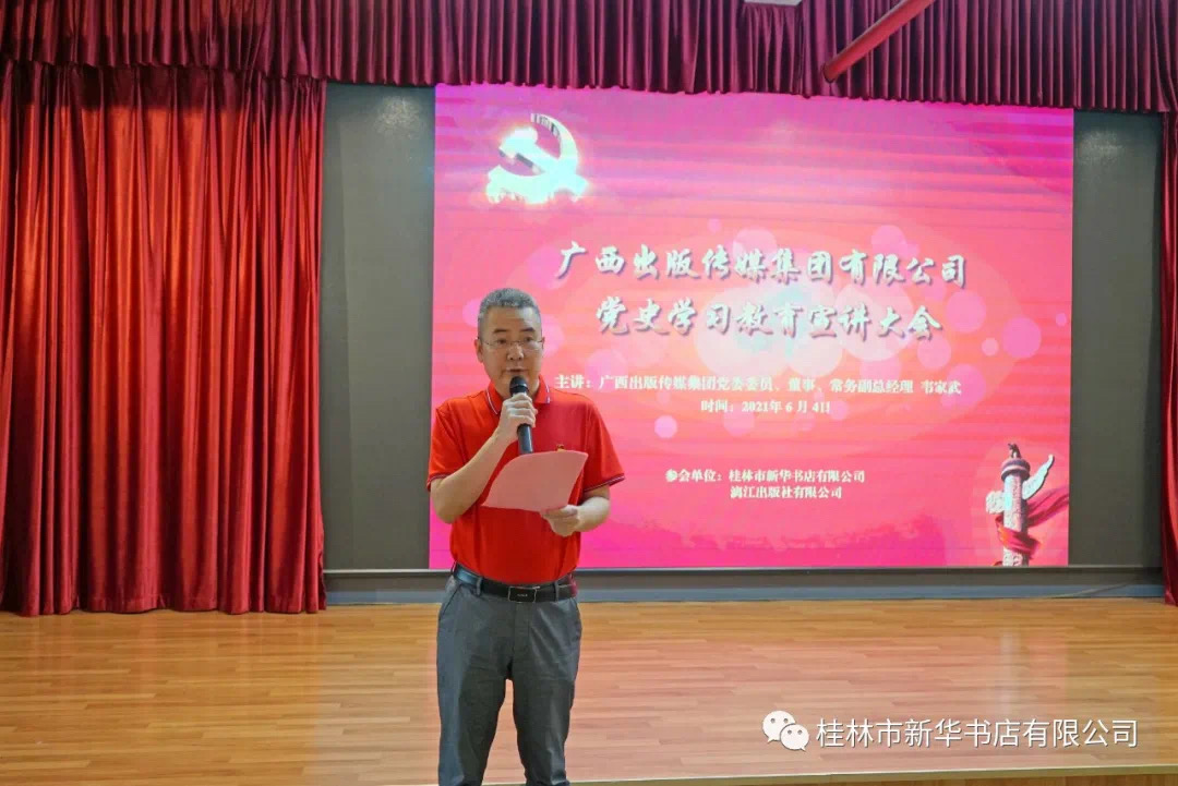 6月4日上午,为进一步推进党史学习教育,由广西出版传媒集团有限公司党委委员、董事、常务副总经理韦家武带队的广西出版传媒集团党史学习教育第五宣讲团,到桂林市开展党史学习教育专题宣讲。桂林市新华书店有限公司(以下简称桂林市公司)和漓江出版社有限公司(以下简称漓江社)党员、发展对象、入党积极分子和群众共120人聆听了韦家武同志的宣讲。