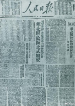 1948年6月15日,晋冀鲁豫解放区《人民日报》与《晋察冀日报》合并后出版的《人民日报》创刊号。