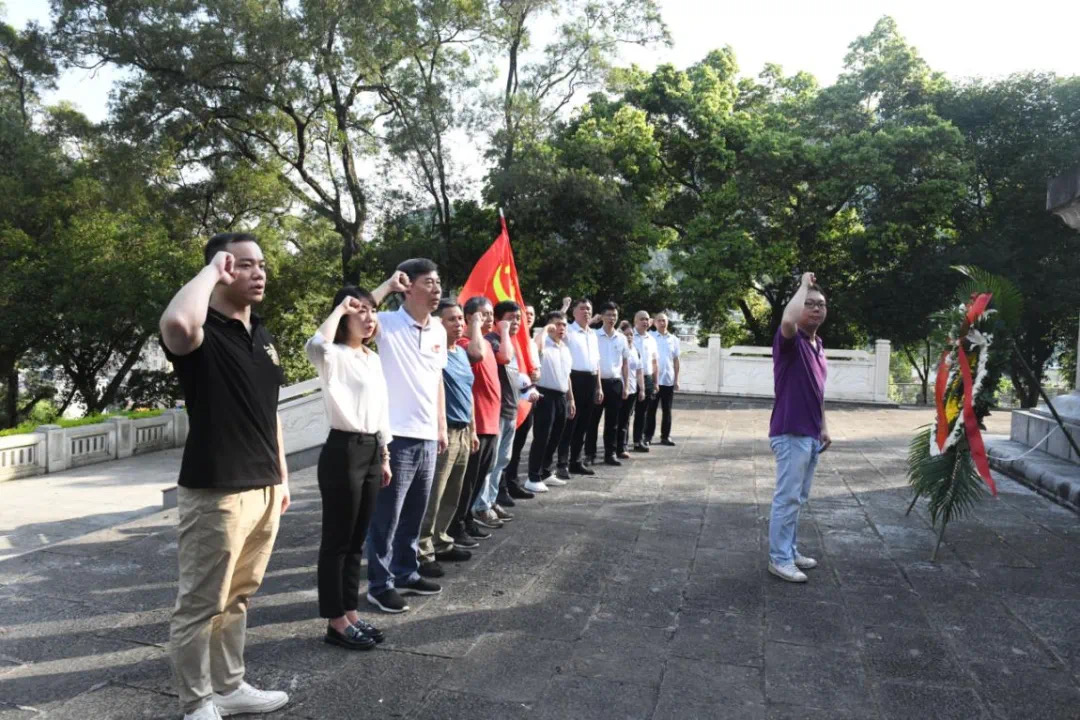 在东兰县烈士陵园,两个党支部向烈士纪念碑敬献了花圈,出版传媒集团第二党支部书记欧建军、东兰县公司党支部书记韦琳鑫共同整理花圈缎带,表达了对革命烈士深切的缅怀和崇高的敬意;敬献花圈仪式结束后,在出版传媒集团第二党支部纪检委员黎旭诚的带领下,全体党员庄严肃立、举起右拳,以洪亮的声音、激昂的斗志重温入党誓词,重温入党初心。敬献花圈、重温入党誓词仪式由出版传媒集团第二党支部组织委员兼宣传委员林春燕主持。