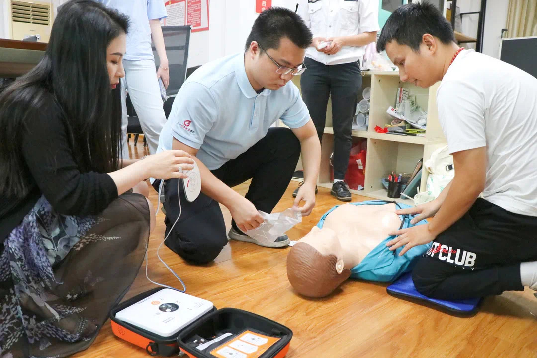 培训中,老师为学员们演示了院外心肺复苏+自动体外除颤仪(AED)的使用,气道异物梗阻急救,突发事件(火灾、地震、踩踏等)中的防灾避险和现场急救等内容。