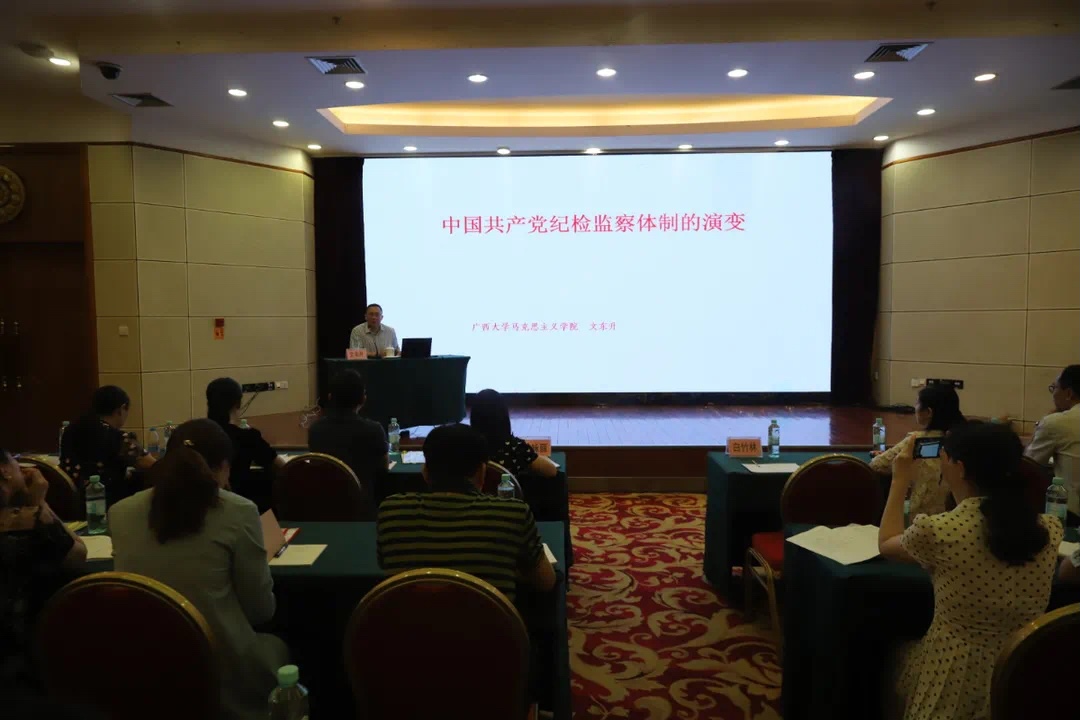 会议契合党史学习教育之机,邀请了广西大学马克思主义学院教授文东升作题为《中国共产党纪检监察体制的演变》的专题讲座。讲座按照时间脉络,系统地梳理了建党100年来纪检监察体系的演变历程,回溯了党的纪检监察机构建立和发展的历史进程,进一步加深纪检监察干部对党内监督体系的认识,了解党内监督专责机关的职能作用,从而更好地适应全面从严治党新形势新任务。