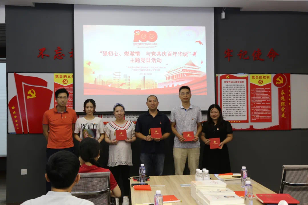 在庆祝中国共产党成立100周年之际,为深入开展党史学习教育,营造浓厚的颂党、敬党、爱党氛围,6月29日下午,广西新华书店集团股份有限公司(以下简称集团股份公司)机关第三党支部、广西新华文盛图书有限公司(以下简称文盛公司)党支部联合开展“强初心、燃激情 与党共庆百年华诞”主题党日活动,组织1—6月份入党的党员同志集体过“政治生日”。