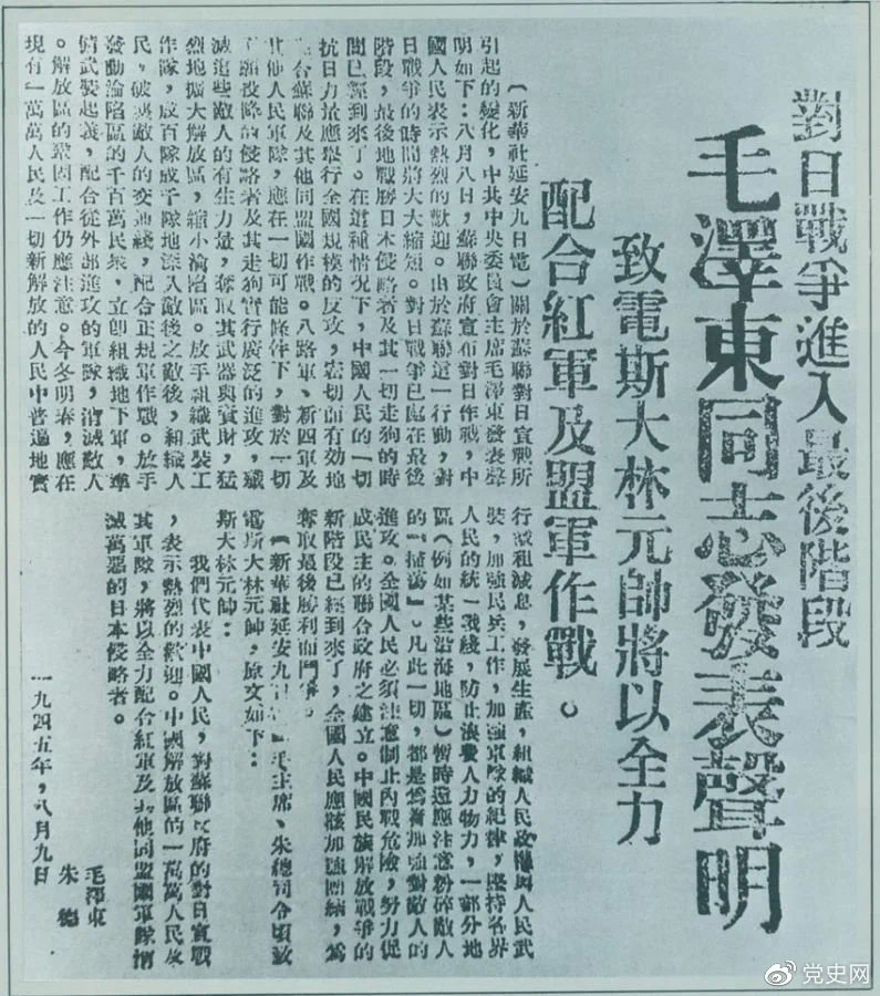 同日 毛泽东就苏联对日宣战发表声明。声明指出:中国人民热烈欢迎苏联对日宣战,最后地战胜日本侵略者及其一切走狗的时间已经到来了。中国人民的一切抗日力量应举行全国规模的反攻,密切而有效力地配合苏联及其他同盟国作战。八路军、新四军及其他人民军队,应在一切可能条件下,对于一切不愿投降的侵略者及其走狗实行广泛的进攻。这篇声明以《对日寇的最后一战》为题,收入《毛泽东选集》第三卷。