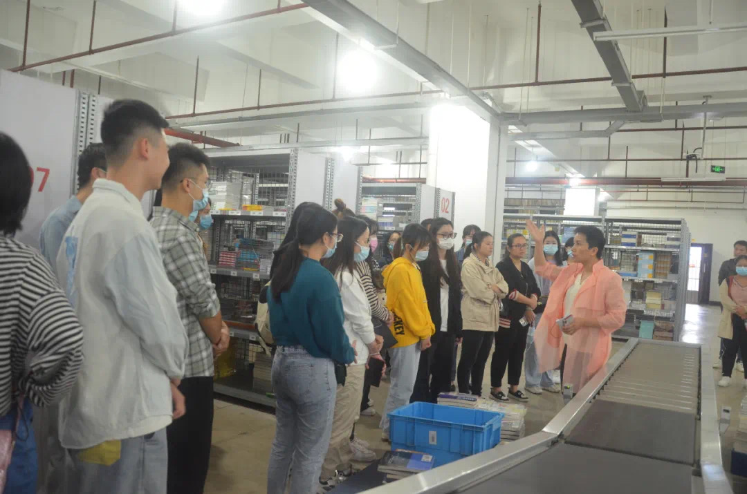 广西新华恒通物流有限公司副总经理李清讲解图书的收、发、存工作流程,仓库各区域的功能