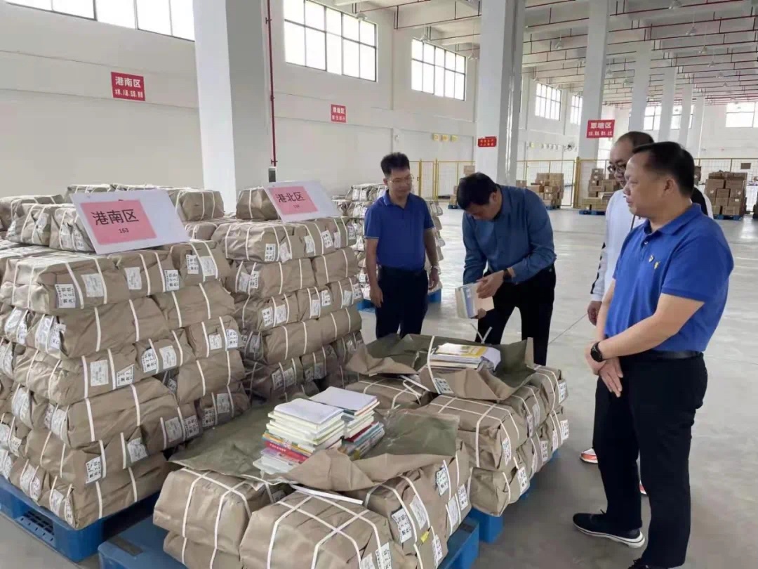 10月15日上午,贵港市2021年农家书屋补充更新出版物配送工作正式启动。贵港市港北区融媒体中心主任黄恭雄、贵港市港北区新闻出版局出版股股长周金有一行到贵港市新华书店有限公司(以下简称贵港市公司)储运中心现场检查指导工作,贵港市公司副总经理、工会主席易飞陪同检查。