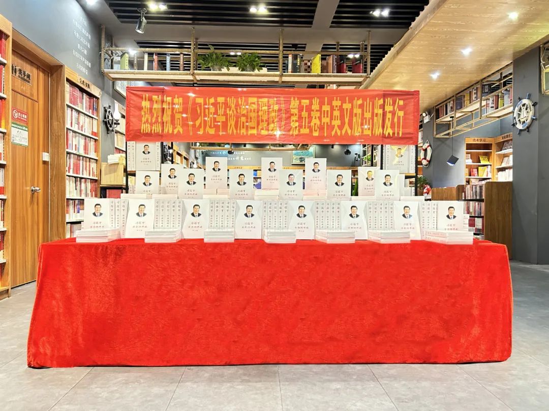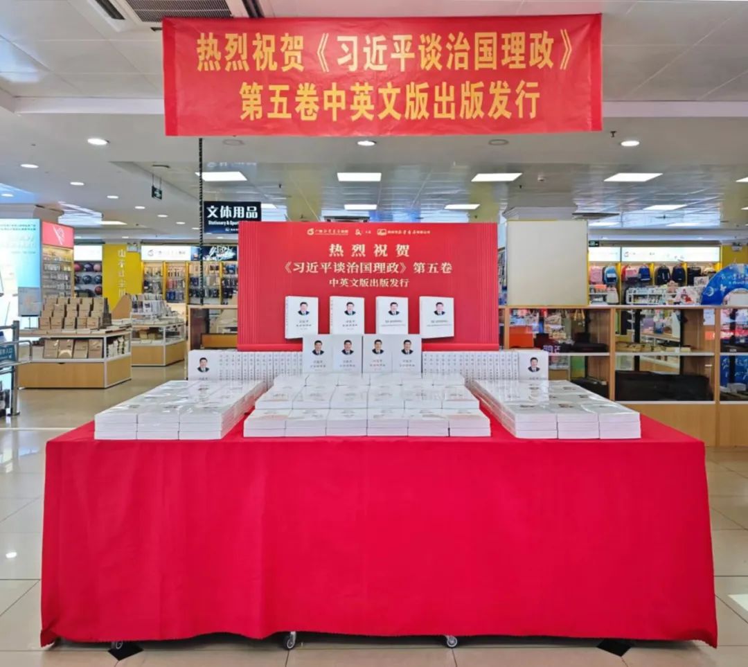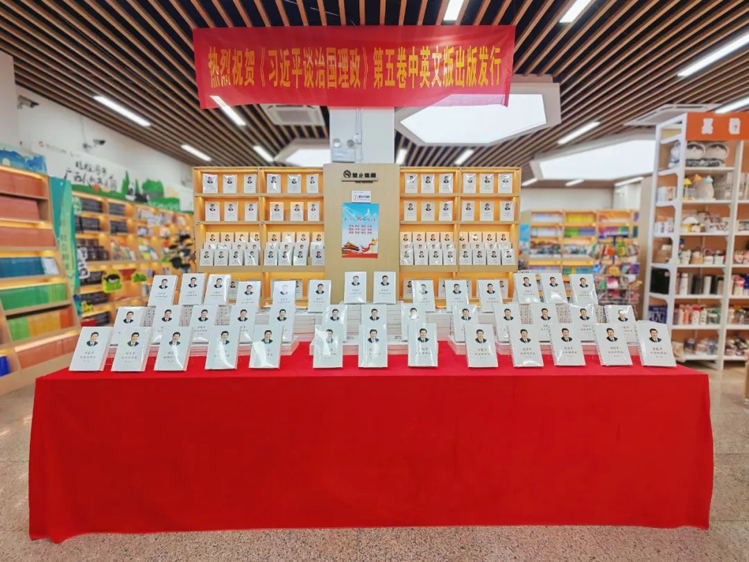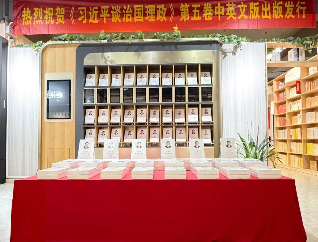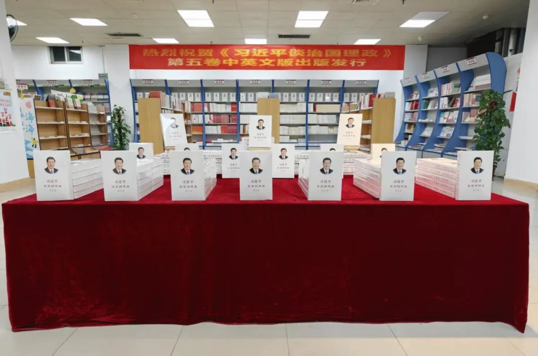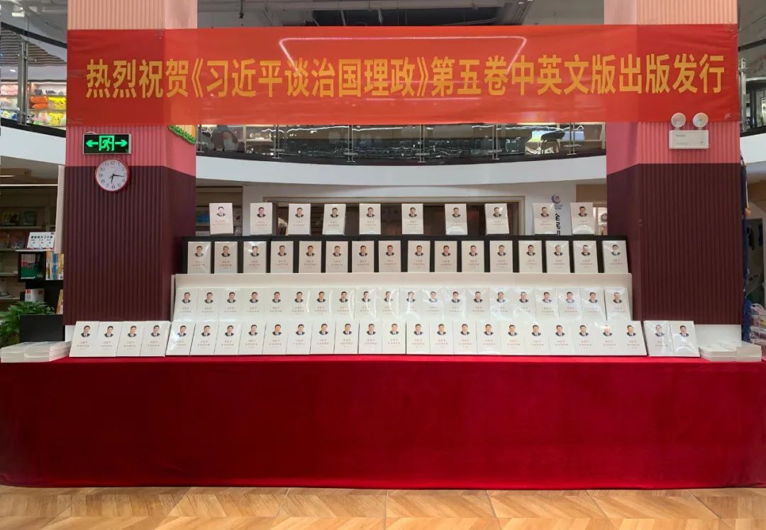 自7月30日上市以来,该书已在全区各地新华书店上架销售,迅速掀起学习热潮。以下为《习近平谈治国理政》第五卷中英文版在全区新华书店主要门店展陈场面。
